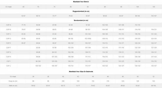 | Maat | 95A, 75A, 75B, 75C, 75D, 80A, 80C, 80D, 80E, 85A, 85B, 85C, 85D, 85E, 90A, 90B, 90C, 90D, 90E, 95B, 95C, 75E, 80B, 95D |