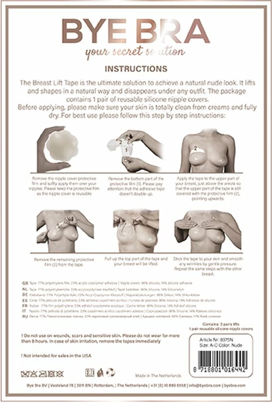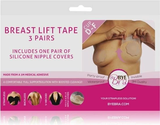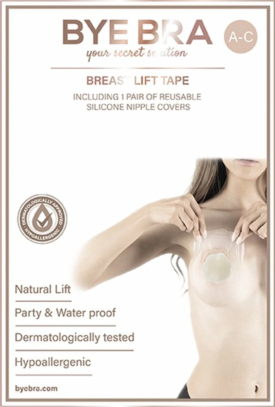 De Bye Bra plak bh is de oplossing om snel en efficiënt de borsten van een vrouw te liften, zonder dat er een BH of een operatie bij te pas komt. De Bye Bra is heel dun en bevat een flexibel zelf plakkend folie. Hiermee is het mogelijk de tepels centimeters te liften of om de borsten te corrigeren. De 3M tape is veilig voor de borsten, wat wij niet kunnen onderstrepen bij Chinese kopieën die we hier en daar op de markt zien. Ook wanneer borsten verschillen in grote of vorm is de Bye Bra plak beha een uitkomst vanwege het corrigerende vermogen.