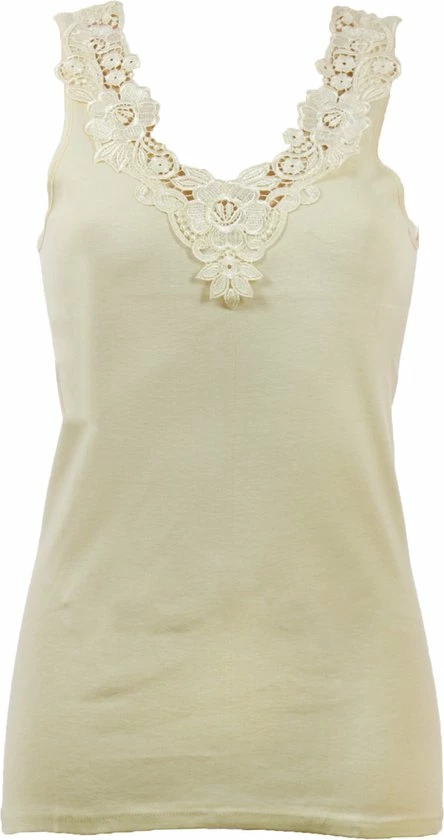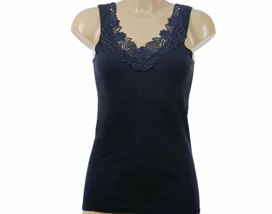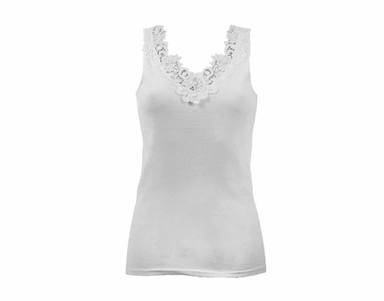 100% katoenen hemdje met brede schouderbanden met mooie brede kantde kant loopt tot de schoudernaden door.de hemdjes vallen ruim uit.onderkant hemdje is omgezoomdafmeting hemdjes:maat 44/46 omtrek 78 cmmaat 48/50: omtrek 86 cmmaat 52/54: omtrek 94 cm