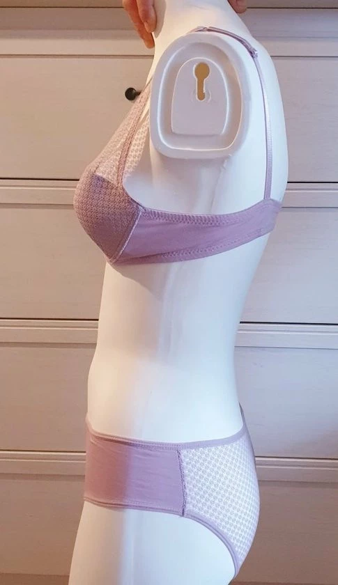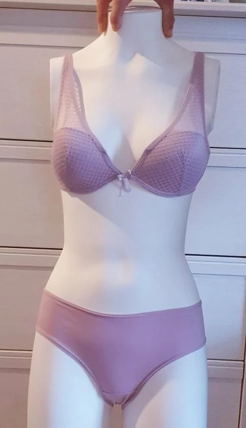Erg mooi model katoenen lingerie set. Bestaat uit beha met voorgevormde cup en met driehoekig kant. De slip is katoen in de voorkant en doorzichtige kant achter.