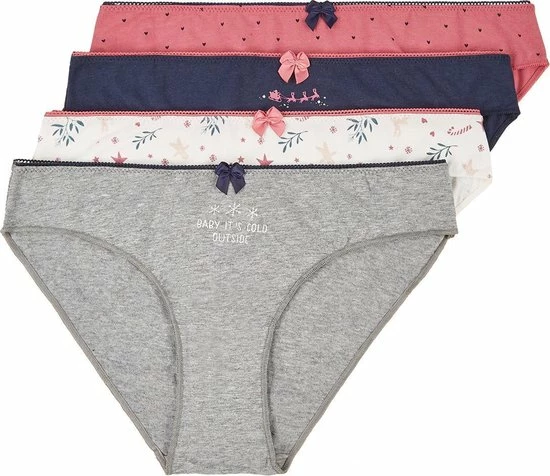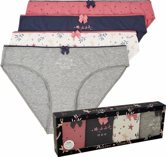 Happy Shorts dames kerst ondergoed special. Voordeel pack van 4 kerst dames slips verpakt in een leuke geschenkverpakking.