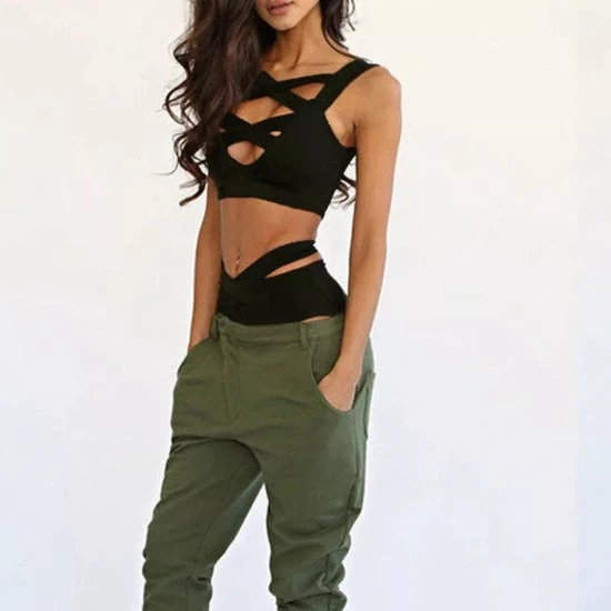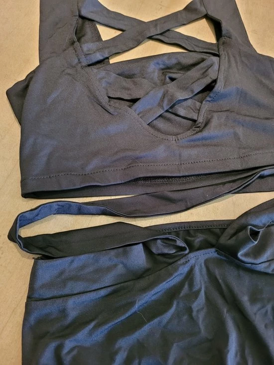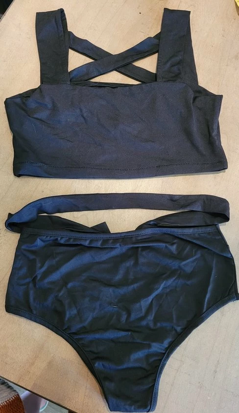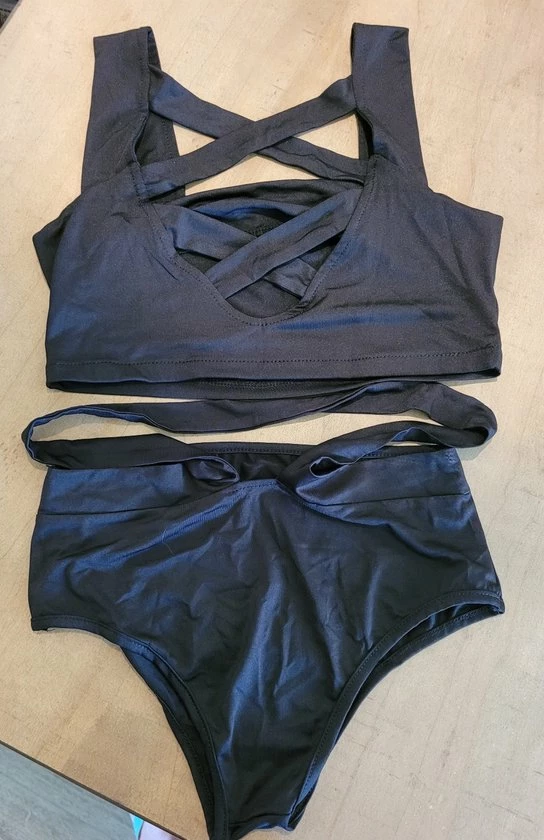 Sexy en aparte bikini met hogere slip en een band die achter de rug gaat, de boven stuk is met kruis banden aan de voorkant, brede schouder banden