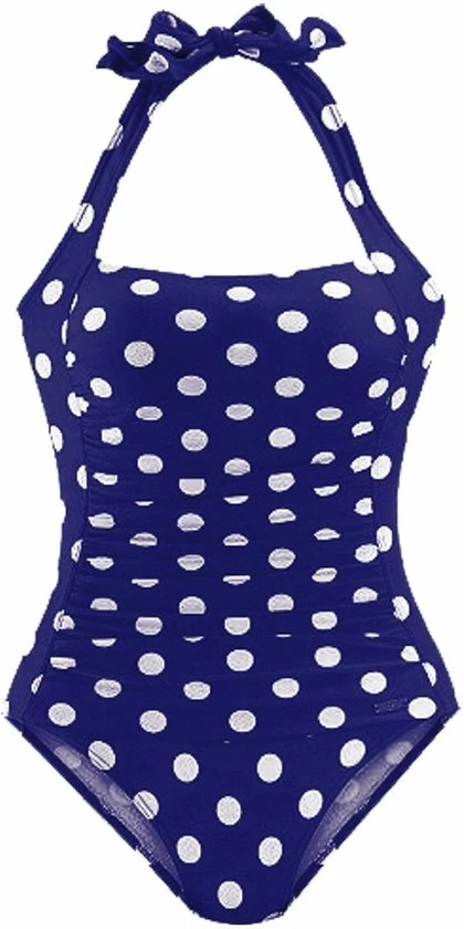 Het badpak met modieuze stippenprint garandeert een flatterend silhouet met een aangerimpeld lijfje op de buik en verhult probleemzones. De brede bandjes van dit stijlvolle eendelige stuk kunnen in de nek worden geknoopt. Ingebouwde soft cups met elastiek onder de buste zorgen voor een prachtig decolleté.