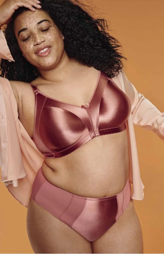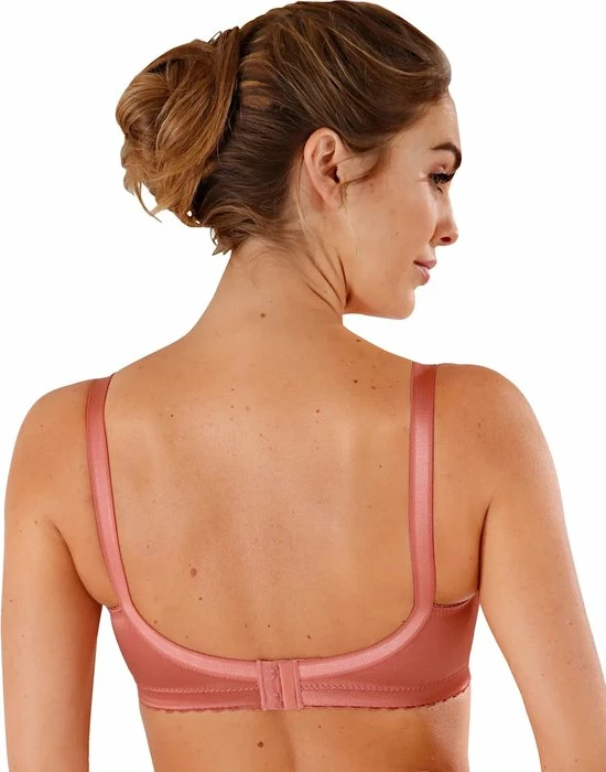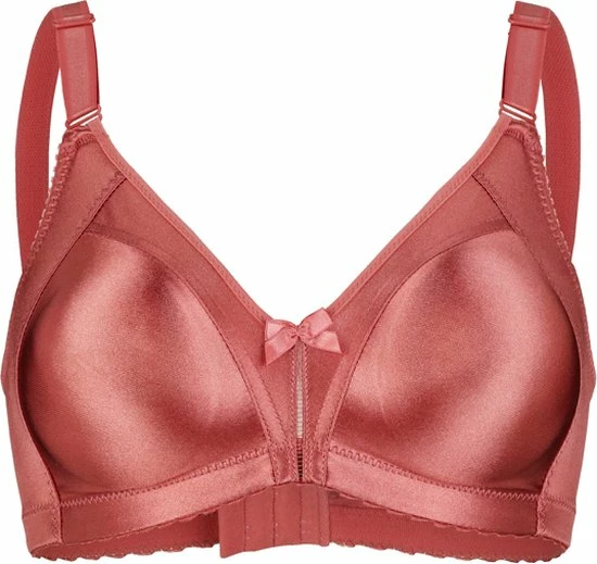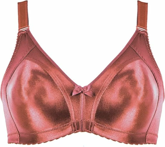 Deze glanzende bh heeft een speciale vorm wat zorgt voor een optisch afslankend effect, een sluiting met 2 haak-en-ogen en is zonder beugel en baleinen.