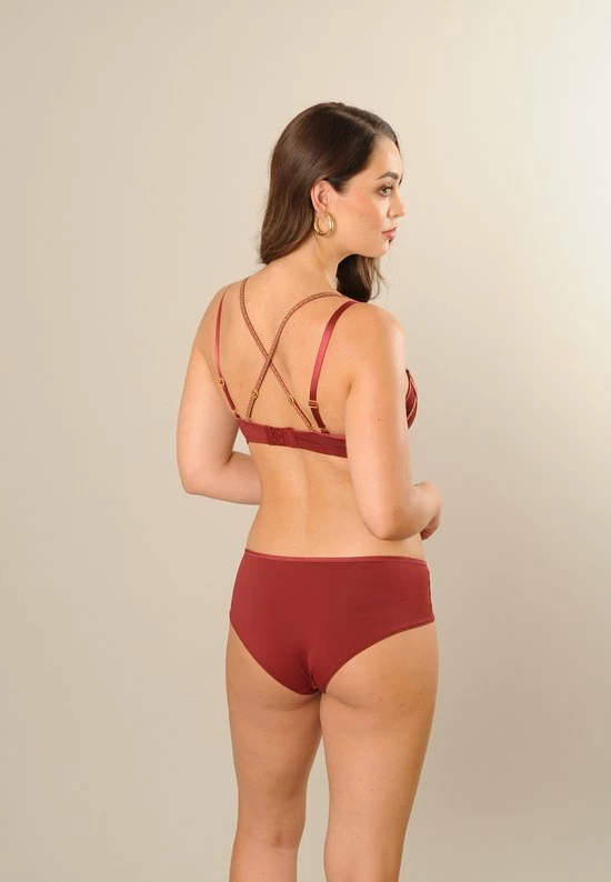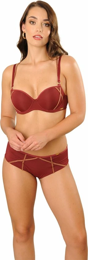 De Mistress is een voorgevormde beugel bh. Dit seizoen ook in de kleur bordeauxrood. Maar ook dit seizoen is de Mistress net iets anders dan voorheen, er zitten namelijk sierbandjes aan de bandjes vast die over de schouder lopen. Hierdoor is de Mistress nu niet alleen stoer maar ook erg sexy! Wil je het volledige setje? Shop dan ook de bijpassende Mistress Short. Ons model is 175 cm en draagt maat 75B.