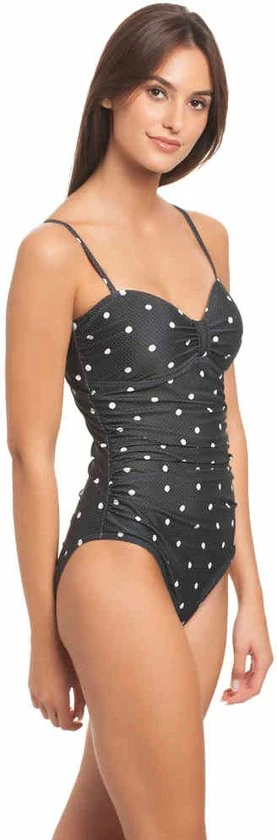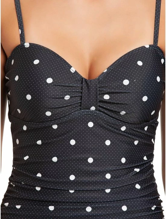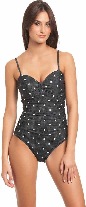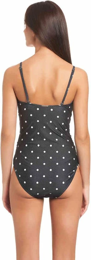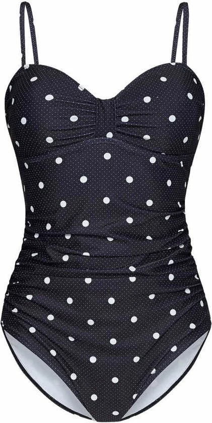 Vive Maria. Mia Maria Zwempak zwart allover. Dit prachtige Vive Maria badpak is gemaakt van een comfortabele polyester-elasthaan mix. De binnenvoering is gemaakt van polyester. Het badpak heeft dunne, verstelbare bandjes die kunnen worden verwijderd en siliconen elastieken in de cups voor een betere ondersteuning. Opzettelijke plooien aan de zijkanten van het badpak flatteren het vrouwelijke silhouet en verbergen kleinere probleemzones. Zowel microdots als grotere stippen sieren de zwarte stof.